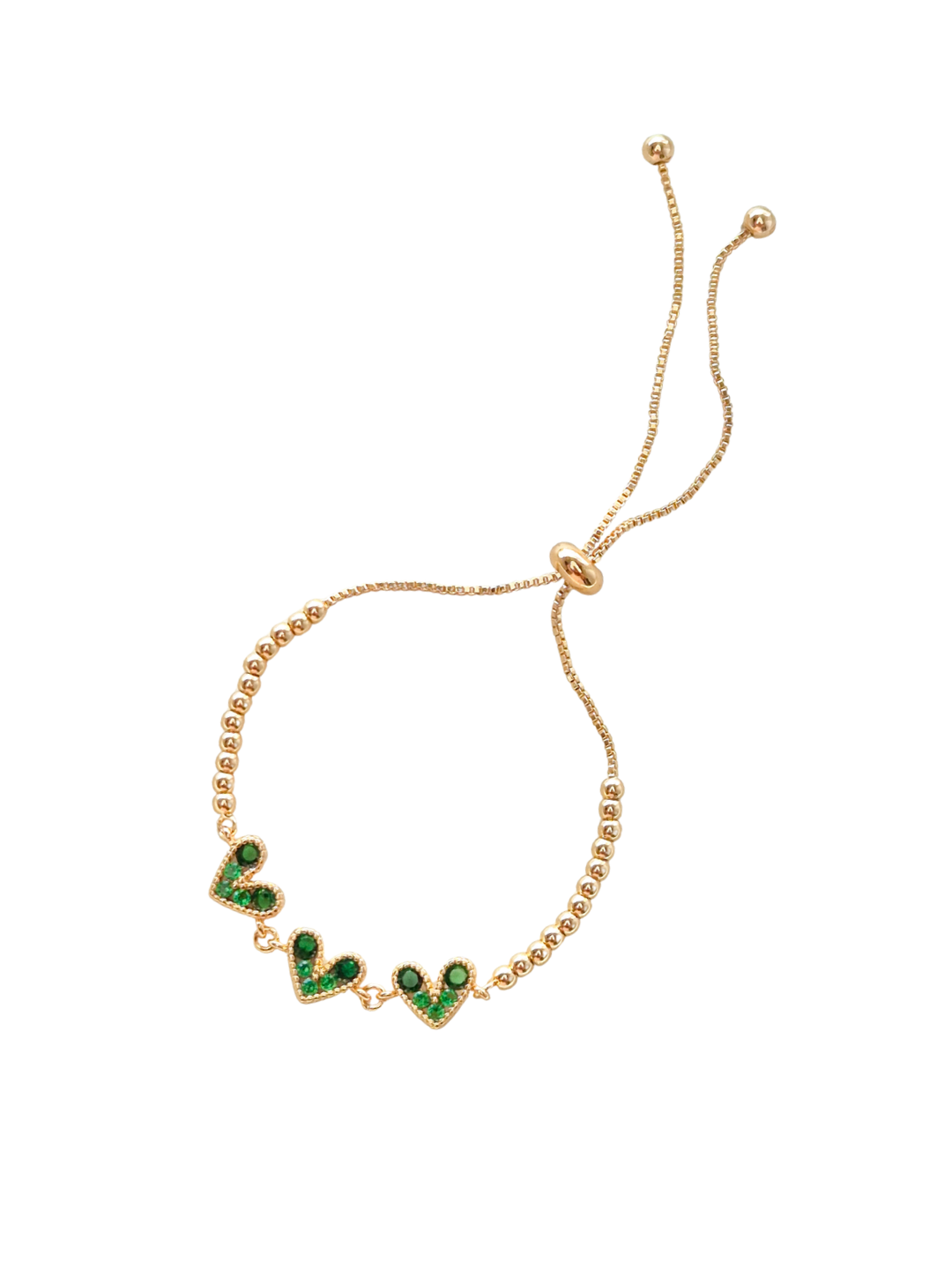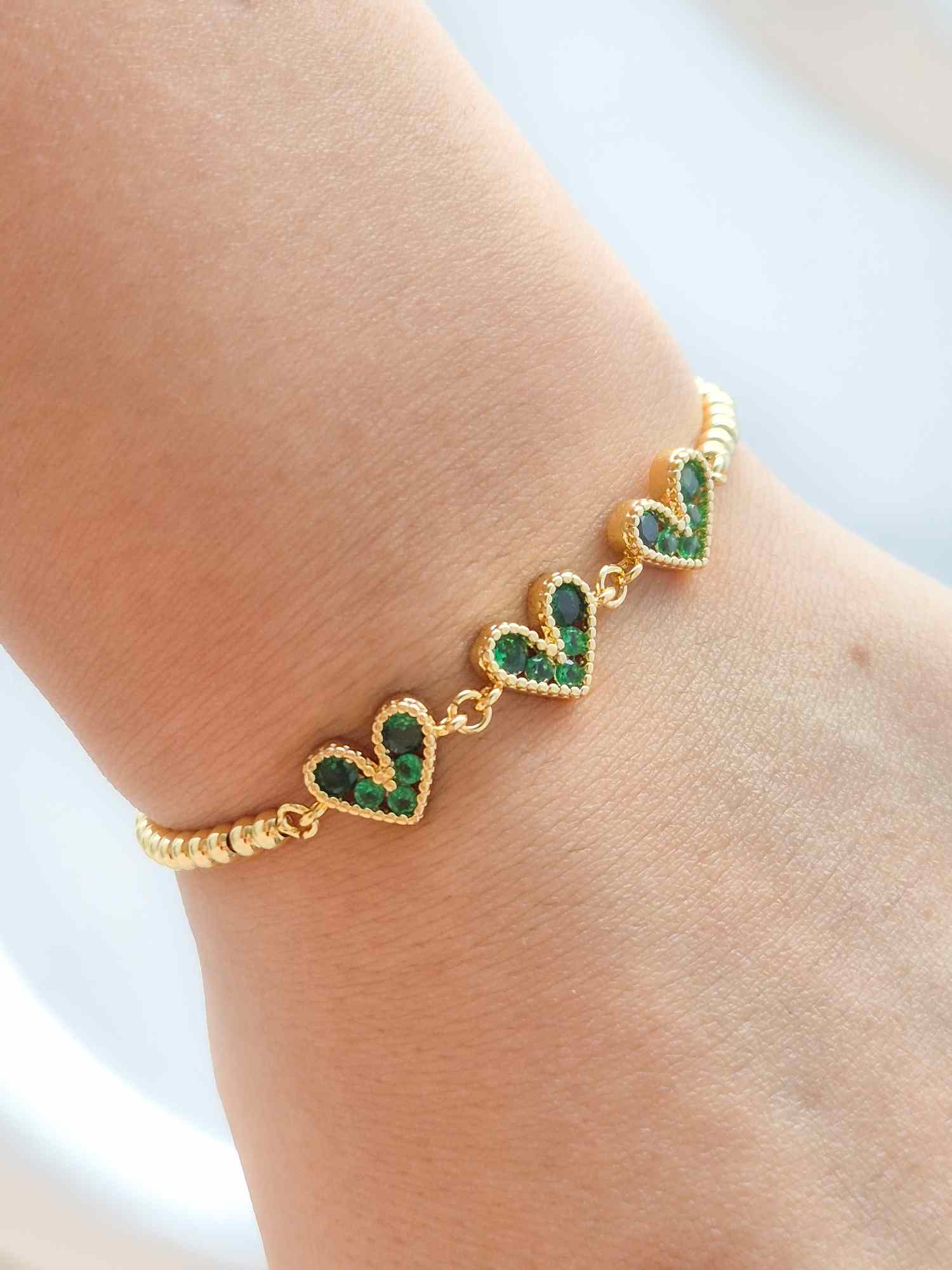 Pulsera dorada regulable de corazones con circones color verde.