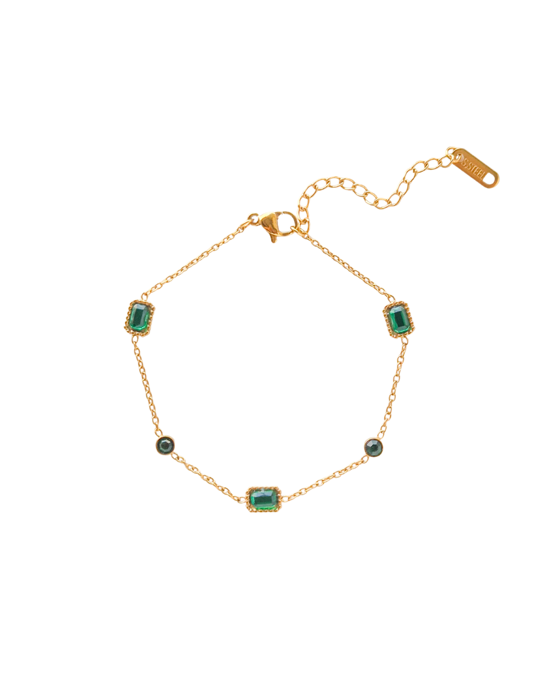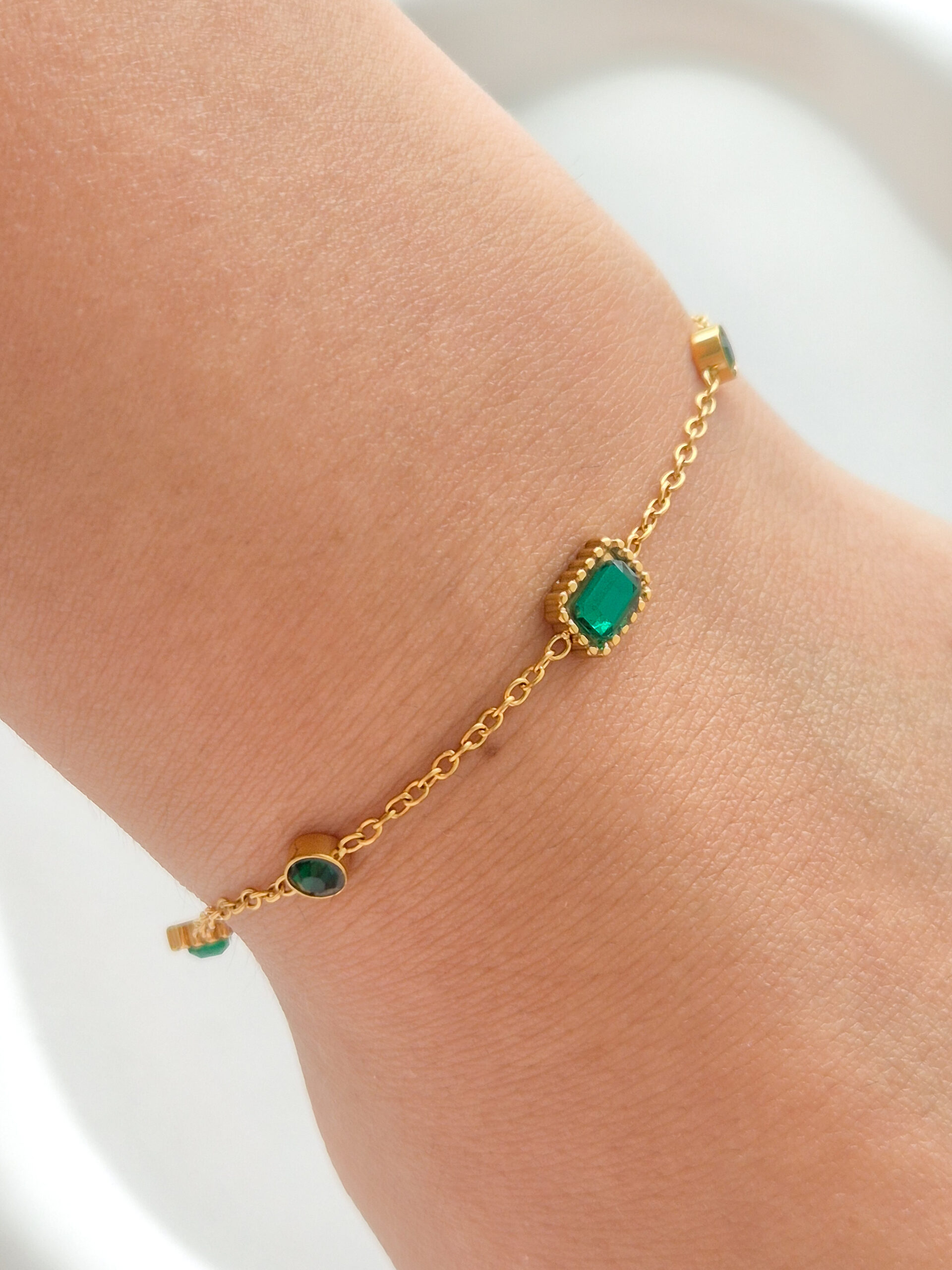Pulsera dorada con piedras verdes.